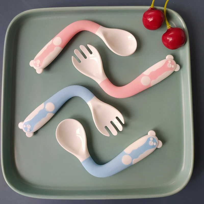 2 Pcs/Set Cute Cartoon Food Grade PP Baby Spoon Tableware Bendable Baby Utensil Spoon Fork Feeding Dishware Set